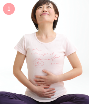 両手をおなかに当て、8秒かけてゆっくり鼻から息を吸い、おなかをふくらませる。慣れてきたら、斜め上を見ながら行うと効果的。